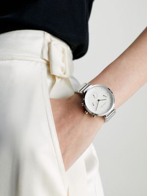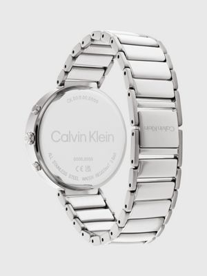 • Calvin Klein logo styling at the dial, clasp and case